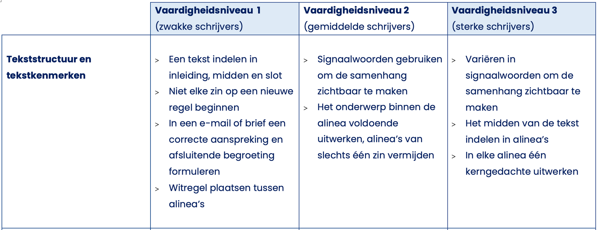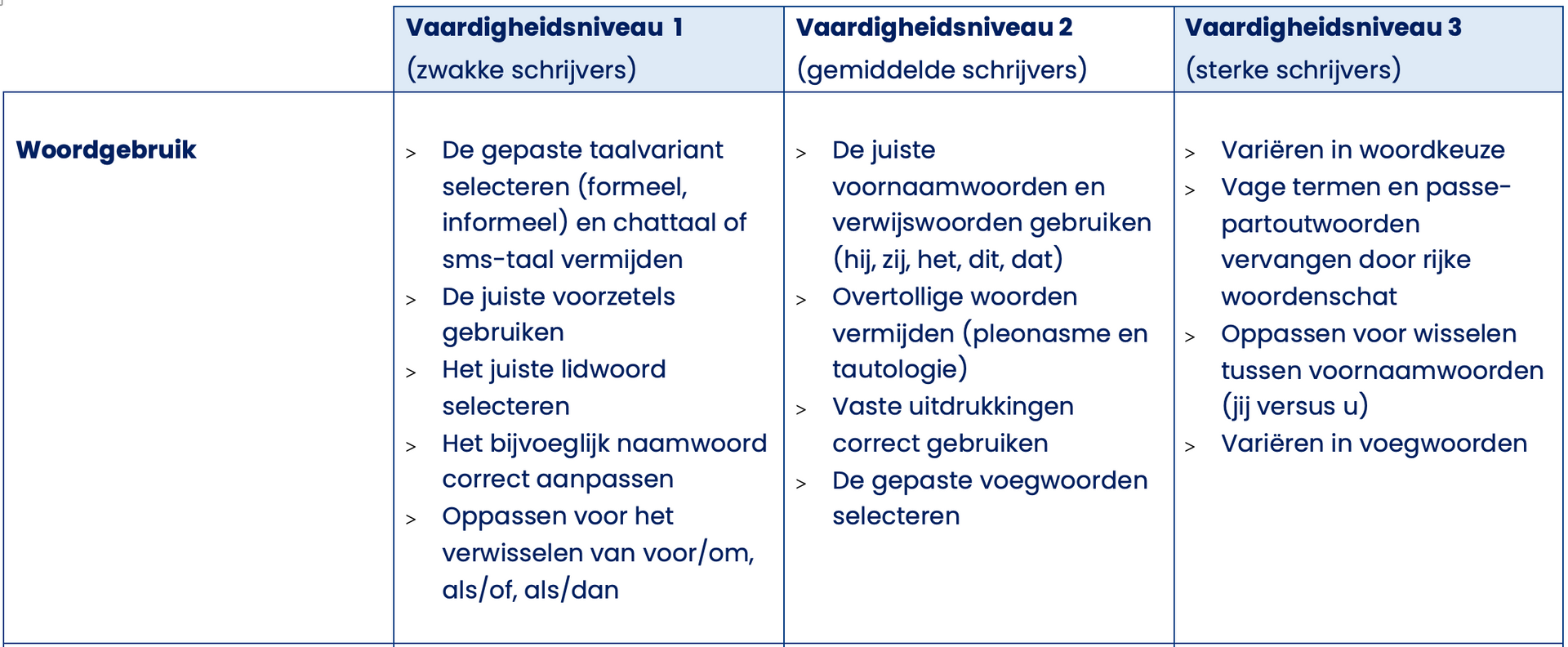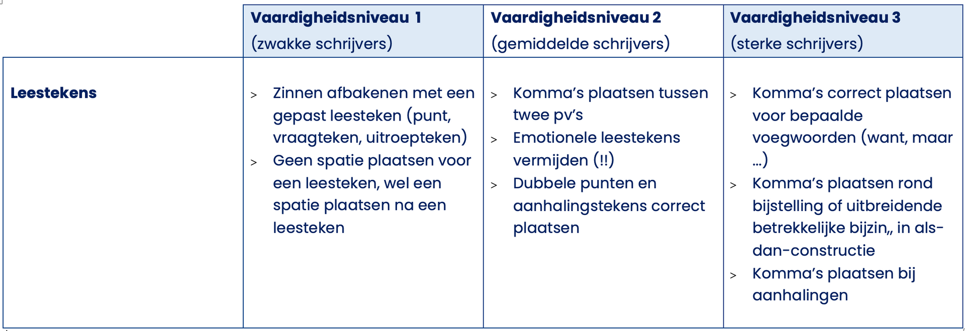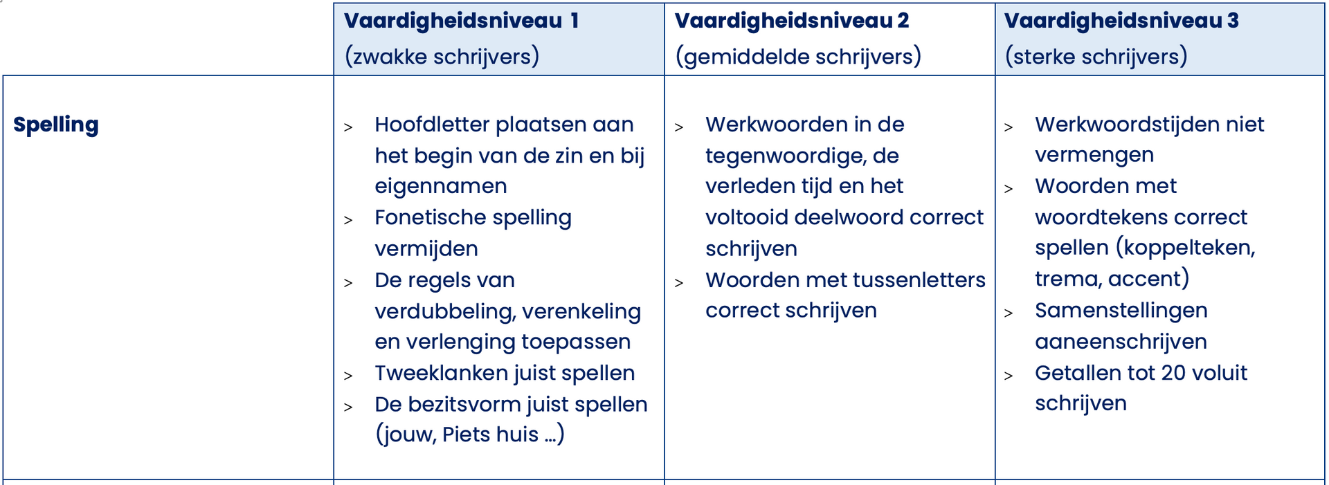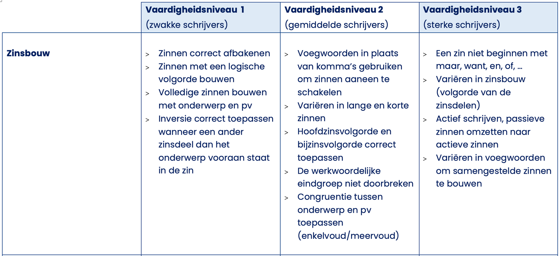 De keuze van de taalbeschouwelijke focus biedt meteen tal van mogelijkheden om te differentiëren. Welke taalbeschouwelijke elementen zijn uitdagend voor sterke schrijvers? Waar worstelen zwakke schrijvers mee? Het overzicht hieronder helpt je om de