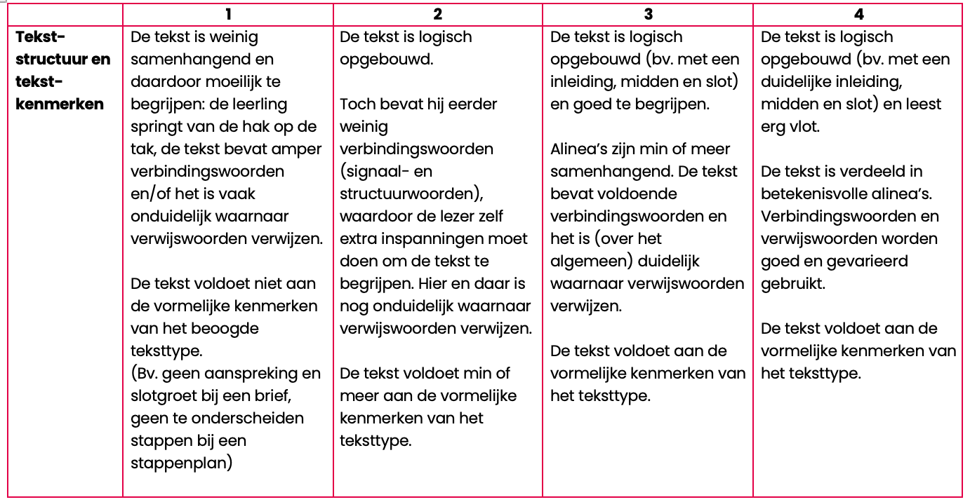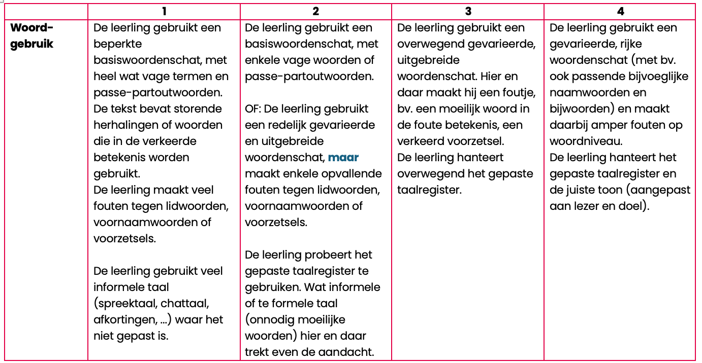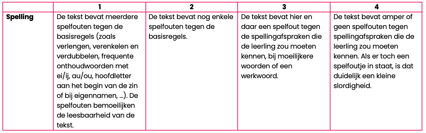 Uit onze bevraging komt naar voren dat leerkrachten schriftelijk feedback geven op leerlingteksten als erg tijdrovend ervaren. Handige evaluatie- en feedbackinstrumenten, zoals rubrics en ankerteksten, kunnen de feedbacktijd verminderen. Voor het project Fungel ontwikkelden we ook een aantal makkelijk hanteerbare scorewijzers. Je vindt ze ter inspiratie op de pagina over het project Fungel. In je eigen scorewijzer kan je onder 'taal' de taalbeschouwelijke focus opnemen.