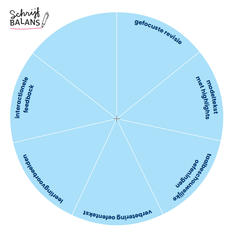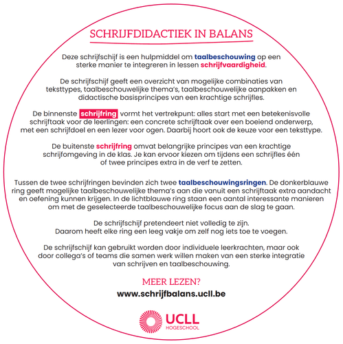 didactisch hulpmiddel om taalbeschouwing op een sterke manier in lessen schrijfvaardigheid te integreren. Het model geeft een overzicht van mogelijke combinaties van teksttypes, taalbeschouwelijke thema’s, aanpakken en didactische basisprincipes van een krachtige schrijfles. Zo stimuleert de schrijfschijf leerkrachten om de mogelijkheden voor een geïntegreerde les(senreeks) breed te verkennen en bewuste keuzes te maken.